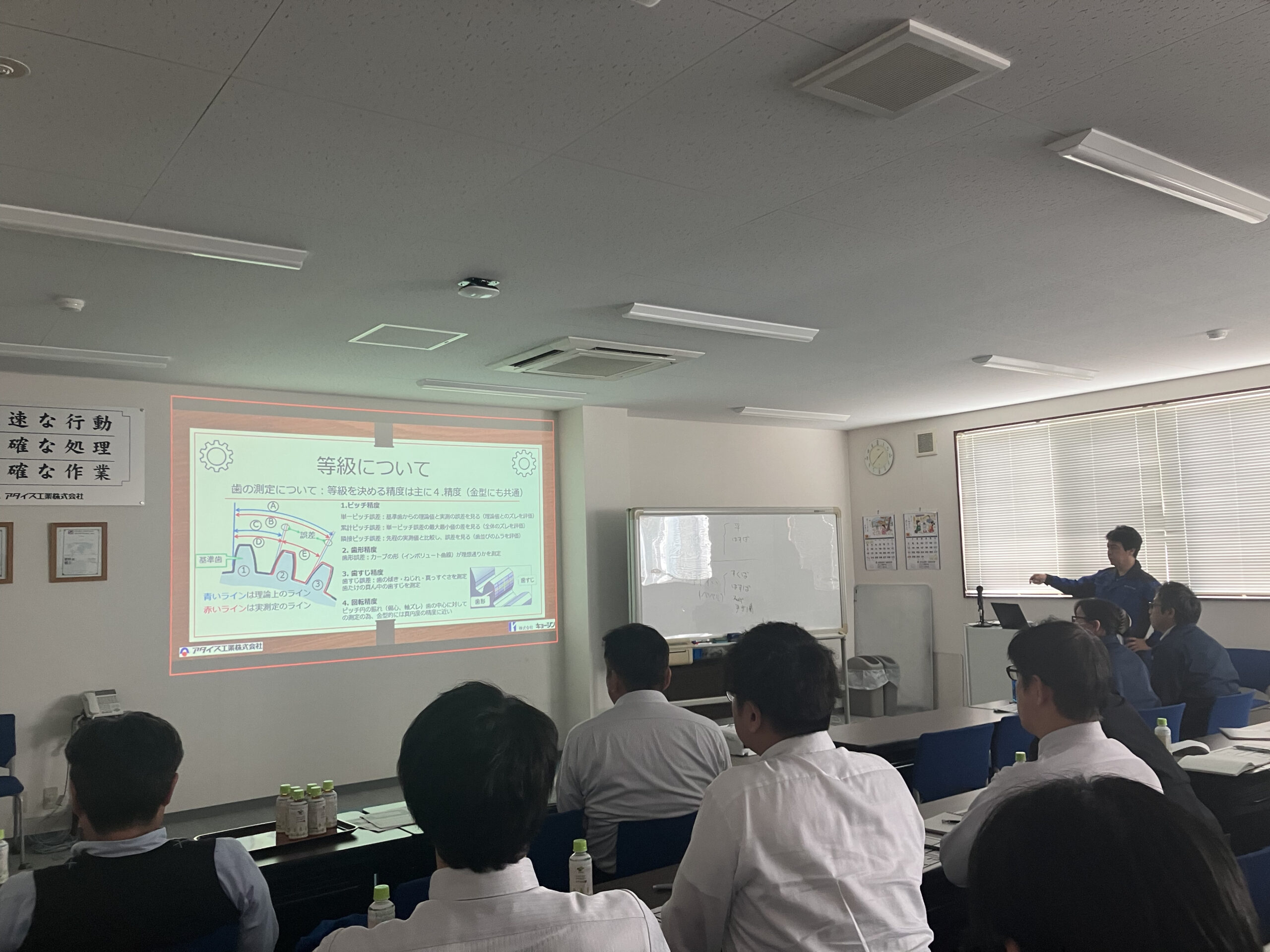 研修では、「スパーギヤ(平歯車)」や「ヘリカルギヤ(はすば歯車)」といった基本的なギヤの種類や構造について解説していただきました。